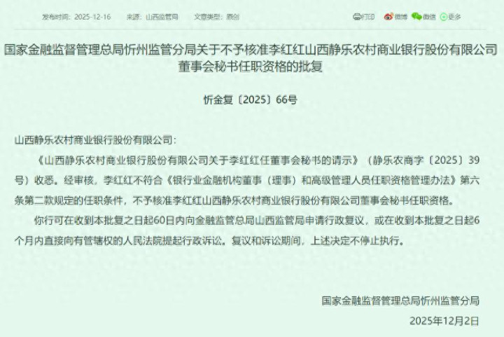 据山西忻州金融监管分局公布的忻金复〔2025〕66号文件,经审核,李红红不符合《银行业金融机构董事(理事)和高级管理人员任职资格管理办法》(以下简称《办法》)第六条第二款规定的任职条件,该局不予核准李红红山西静乐农商银行董事会秘书任职资格。