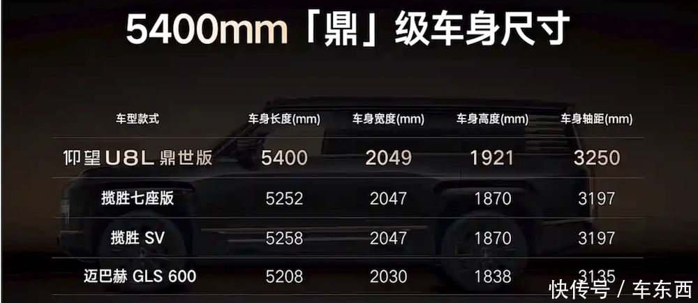 车身尺寸方面,比亚迪仰望U8L鼎世版车身尺寸为5400/2049/1921mm,轴距为3250mm,相比U8豪华版长度增加81mm,轴距增加200mm。