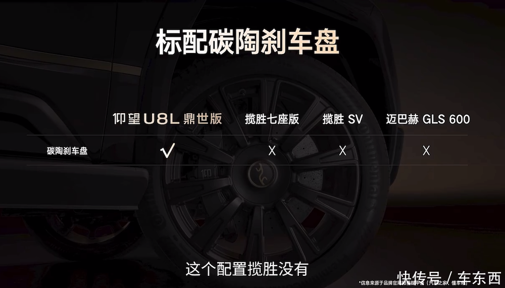 同时,仰望U8L还配备易四方、云辇-P两大核心技术,同样能够实现包含应急浮水、爆胎稳行、原地掉头在内的多种安全能力,新车前后均采用双叉臂独立悬架,升级双阀液压减震器,标配碳陶刹车盘,进一步提升驾驶舒适性。