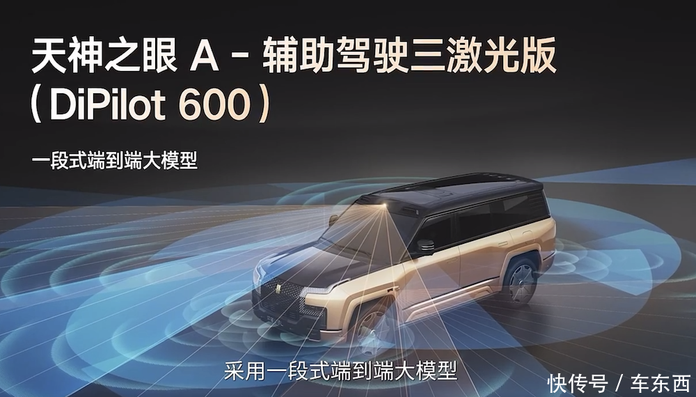 智能辅助驾驶方面,新车搭载天神之眼-A辅助驾驶三激光版(DiPilot 600)一段式端到端大模型,能够实现包含高快领航、城市领航、代客泊车等在内的多种智能驾驶辅助能力。